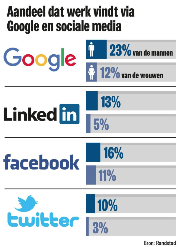 Het verschil is groot. Hoewel mannen en vrouwen ongeveer even vaak sociale media inschakelen om werk te zoeken, liggen de succespercentages heel ver uit elkaar. Een paar voorbeelden: 23 procent van de mannen die werk zoeken via Google, vinden ook werk. Bij vrouwen is dat maar 12 procent. Voor LinkedIn is dat respectievelijk 13 en 5 procent, voor Facebook 16 en 11 procent en voor Twitter 10 en 3 procent.